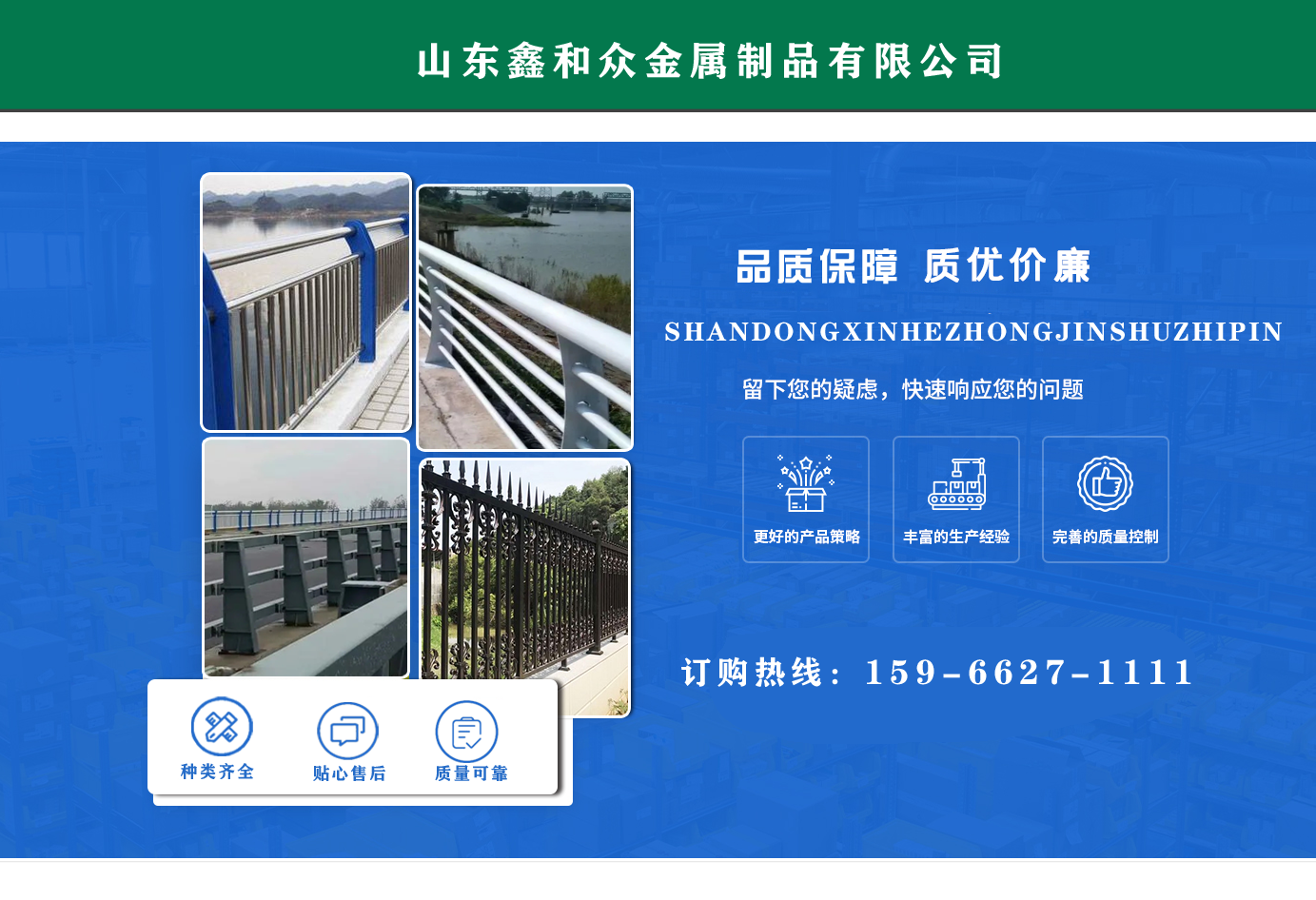 山东鑫和众金属制品有限公司主要产品有防撞护栏,桥梁护栏,道路护栏,河道护栏,不锈钢护栏等护栏。提供设计方案,一站式定制,包您满意价格优惠,欢迎来电咨询! 公司常年从事销售护栏防撞护栏,桥梁护栏,道路护栏,河道护栏,不锈钢护栏,桥梁钢护栏,河道灯光护栏等。产品广泛应用于桥梁、河道、旅游景区、道路、公路、公园、小区、景观、道路防撞等领域?! 」静肪捎糜胖什恍飧植牧?,符合相关标准。各种型号不锈钢复合管及护栏,质量严格把控。产品强度高、耐腐蚀、焊接牢固、抗冲击、性能好,防撞护栏结构简单、美观实用大方。 欢迎前来订购!...